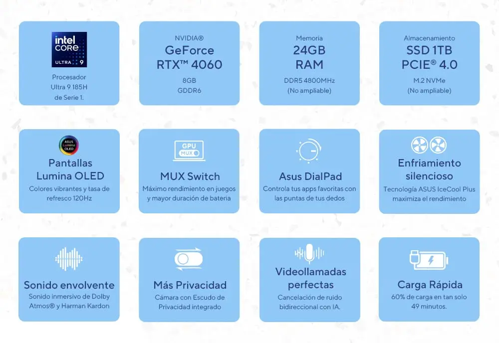 - Intel Core Ultra 9 185H Hasta 5.1GHz (16 Núcleos)