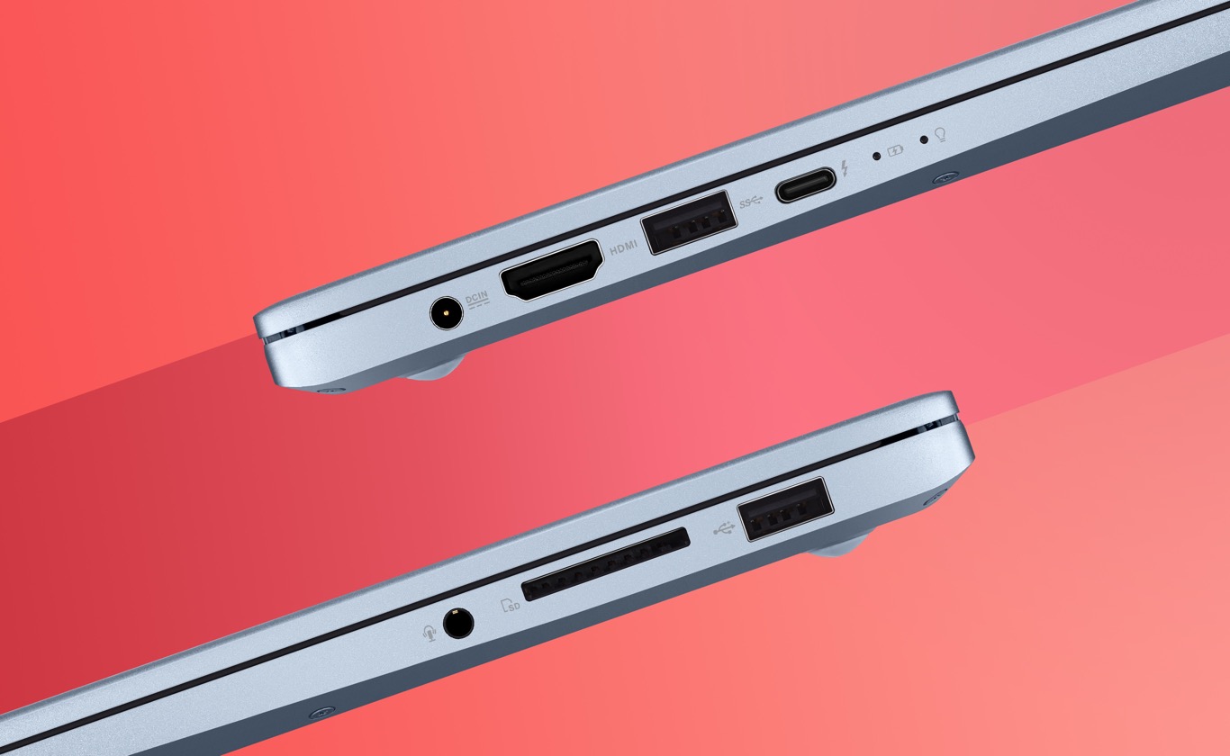 El puerto Thunderbolt™ 3 del VivoBook 14 ofrece velocidades de transferencia de hasta 40 Gbps para transferencias de datos ultrarrápidas, salida de vídeo y soporte de carga rápida. Su diseño USB-C® en cualquier dirección hace que conectar dispositivos sea lo más fácil posible. También obtienes puertos USB 3.1 y USB 2.0, salida HDMI y un lector de tarjetas SD, lo que garantiza la compatibilidad con todos tus periféricos, pantallas y proyectores actuales.