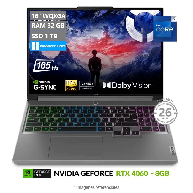 «La Laptop Lenovo Legion 5 Pro 16IRX9 es una poderosa máquina diseñada para gamers exigentes. Su pantalla de 16 pulgadas ofrece una experiencia visual impresionante con alta resolución y colores vibrantes. Su sistema de refrigeración avanzado mantiene el equipo fresco durante largas sesiones. La Legion 5 redefine el gaming portátil.»
