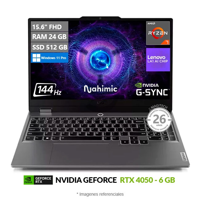 Laptop Lenovo LOQ 15ARP9 (15'') Gaming, AMD Ryzen 7 7435HS Hasta 4.5 GHz, RAM 24GB, SSD 512GB, 6GB NVIDIA GeForce RTX 4050, LED 15.6" FHD 144 Hz