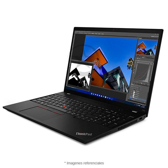 Vista frontal derecha del portátil Lenovo ThinkPad P16s Gen 3 (40,64 cm [16”] Intel) negro con la tapa abierta de par en par, centrado en una aplicación de edición de fotos abierta en pantalla.