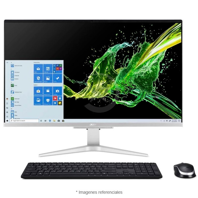 La computadora de escritorio Acer Aspire C27-962-UA91 All-in-One viene con estas especificaciones: Procesador Intel Core i5-1035G1 de décima generación con tecnología Turbo Boost hasta 3. 6 GHz, Windows 10 Home, 27 ″ Full HD Widescreen Edge Pantalla retroiluminada LED hasta el borde, NVIDIA GeForce MX130 con 2 GB de GDDR5 VRAM dedicado, memoria DDR4 de 12 GB, SSD NVMe M. 2 de 512 GB, cámara web HD High-Sense integrada de 1,0 MP, 10/100/1000 Gigabit Ethernet, Wi-Fi 802. 11ac, Bluetooth 5. 0, dos altavoces estéreo integrados, 2 puertos USB 3. 2 (Tipo A) Gen 1, 2 puertos USB 2. 0, 1 puerto HDMI, 1 puerto Ethernet RJ -45 puertos, teclado y mouse inalámbricos, 17. 19 lbs. 7. 8 kg (solo unidad de sistema), 1 año en piezas y mano de obra limitada con soporte técnico gratuito (DQ. BDPAA. 003)